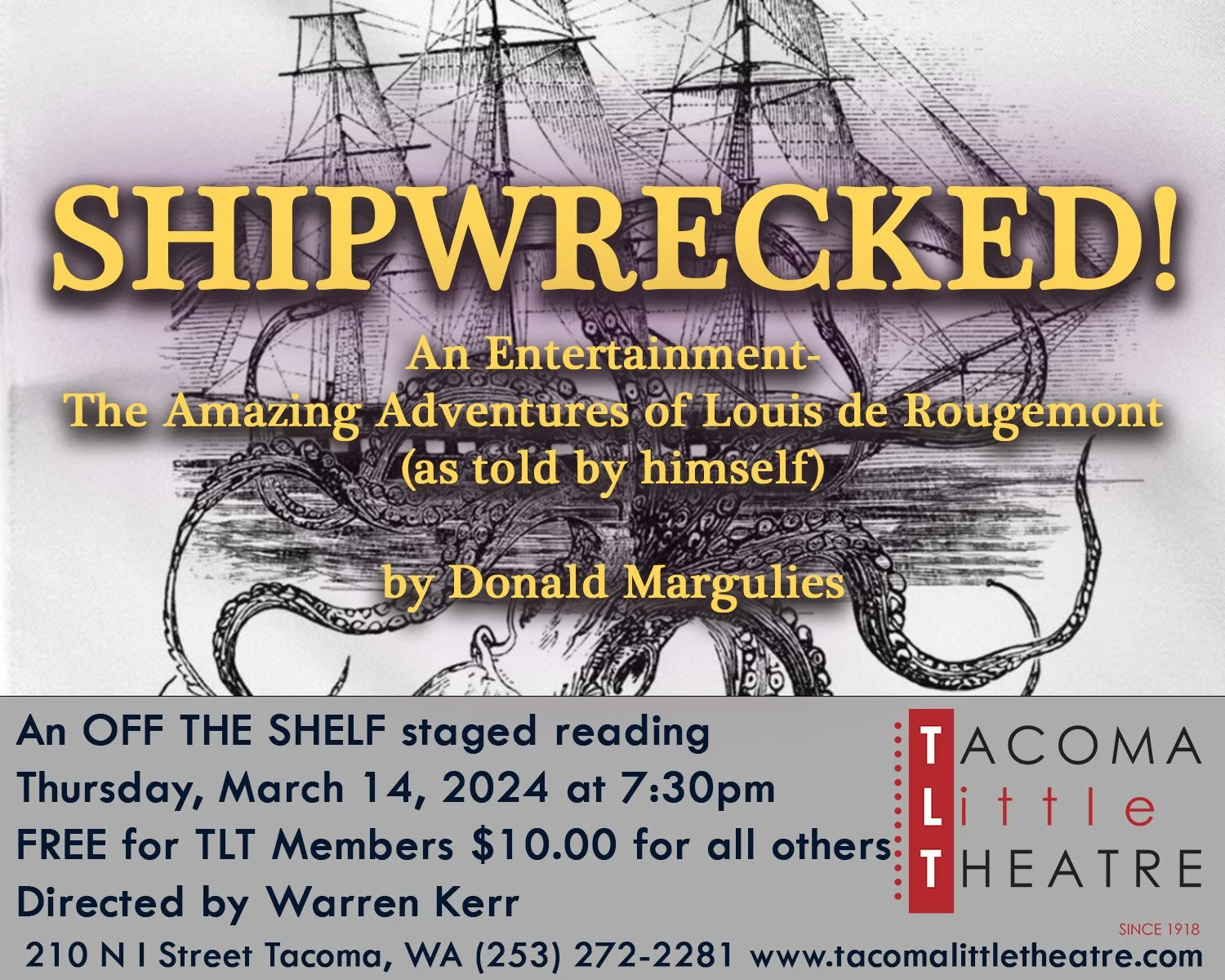 Tacoma Little Theatre's Off the Shelf program is excited to present Donald Margulies’, Shipwrecked! An Entertainment-The Amazing Adventures of Louis de Reougemont (as told by himself). This production will play Thursday, March 14, 2024, at 7:30pm and is directed by Warren Kerr.